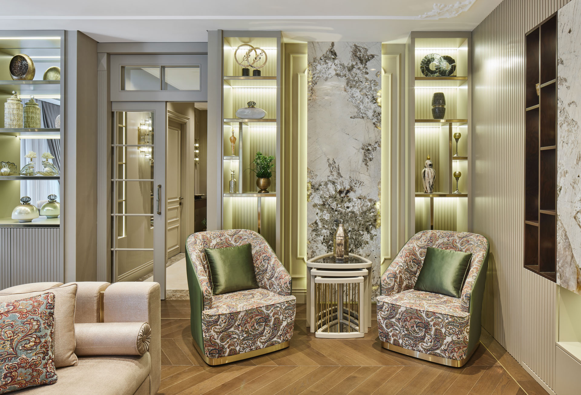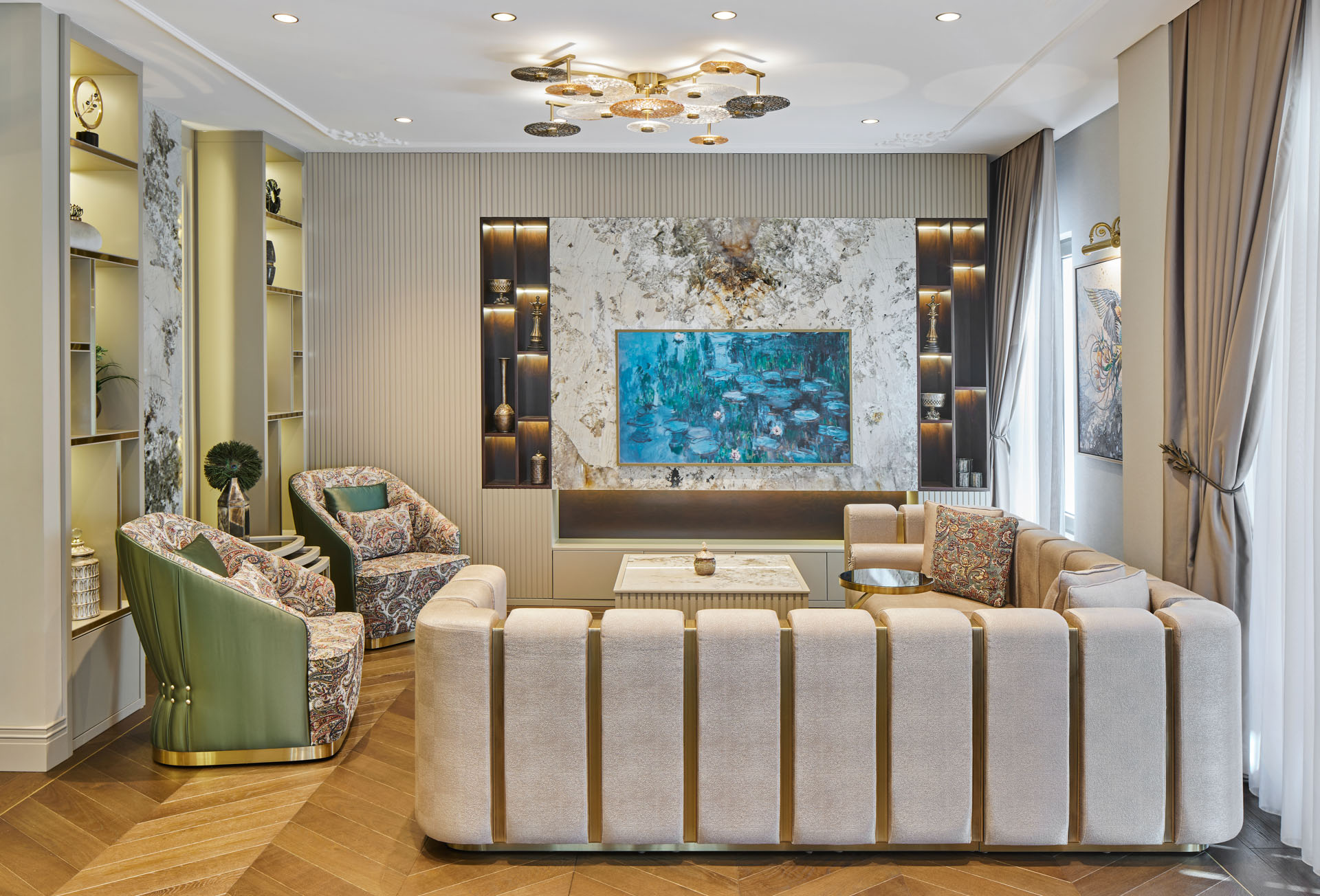 Kaba inşaat aşamasında devraldığımız Villa Aurum, baştan sona firmamızın imzasıyla şekillenen bir tasarım yolculuğudur. Modern klasik tarzın asaletini, altın tonlarının sıcaklığı ve bütünlüğüyle buluşturduk. Yüksek tavanların ferahlığını, mekana özel olarak tasarlayıp ürettiğimiz aydınlatmalar ve el işçiliği mozaiklerle taçlandırdık.