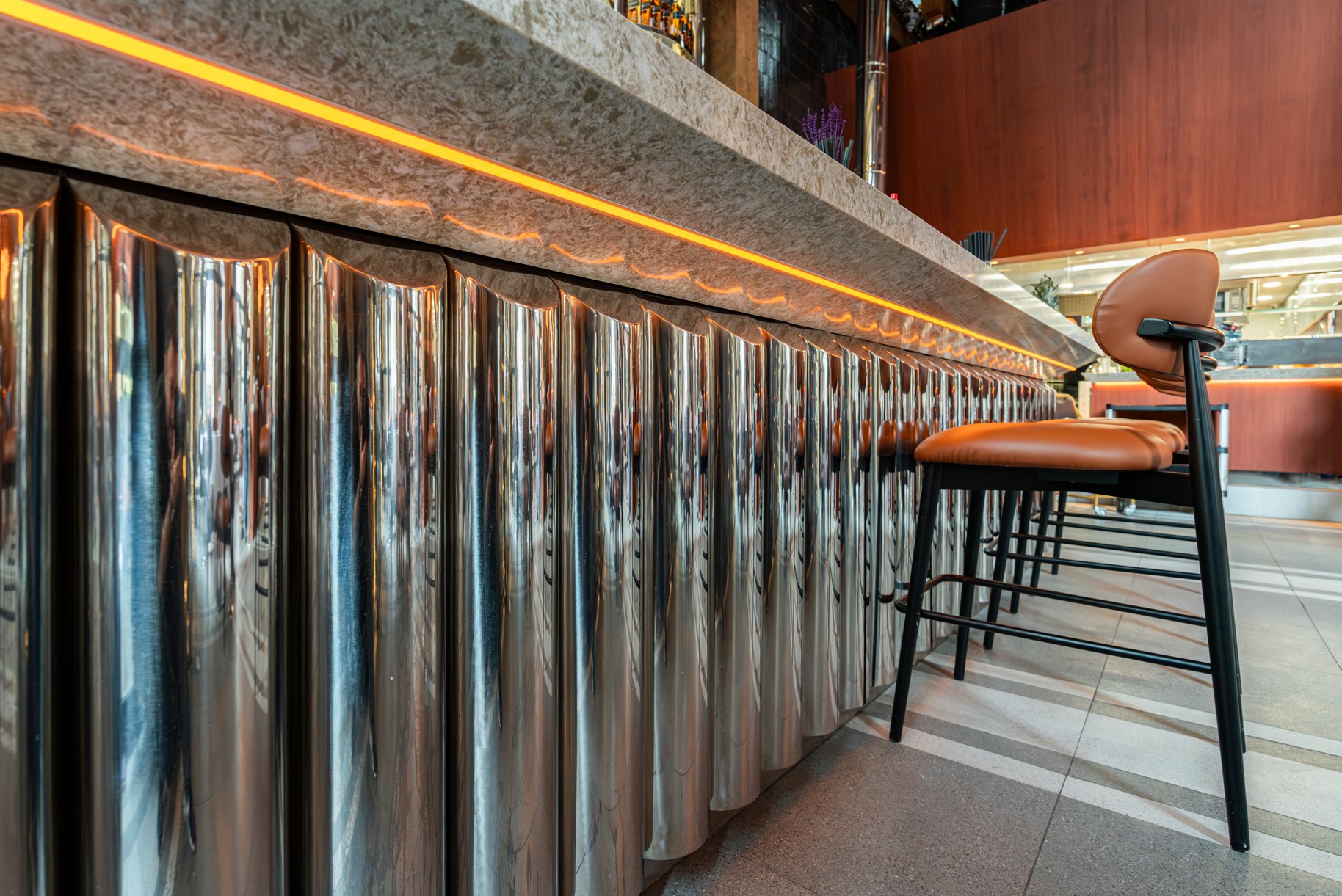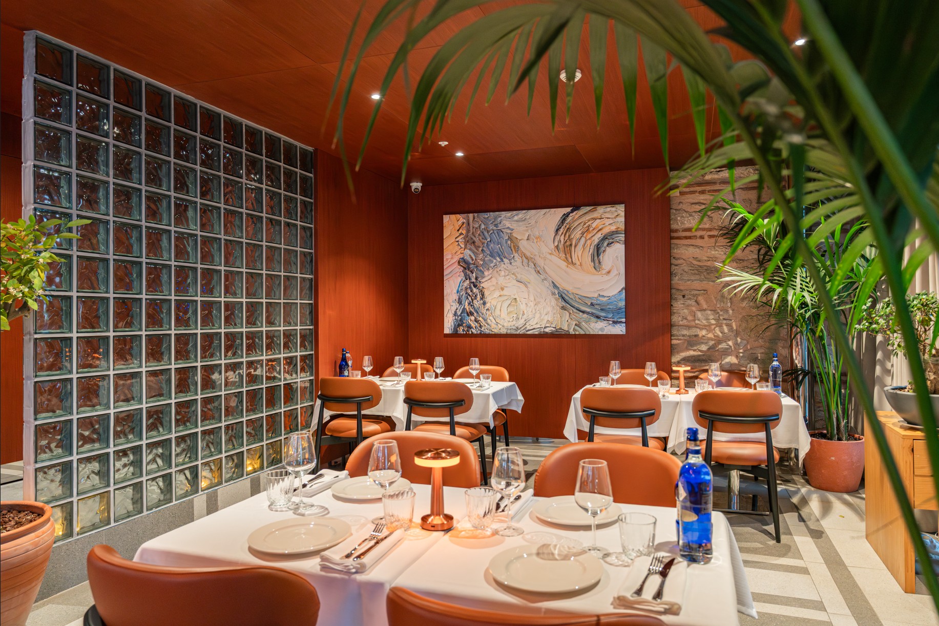 Interior Design Style / Colors: “Historical Industrial Chic & Warm Gastronomy.” Dominant colors include Brick Red/Terracotta (walls), Amber (lighting and bar shelving), Anthracite Black (metal details), and Natural Stone Grey (flooring).