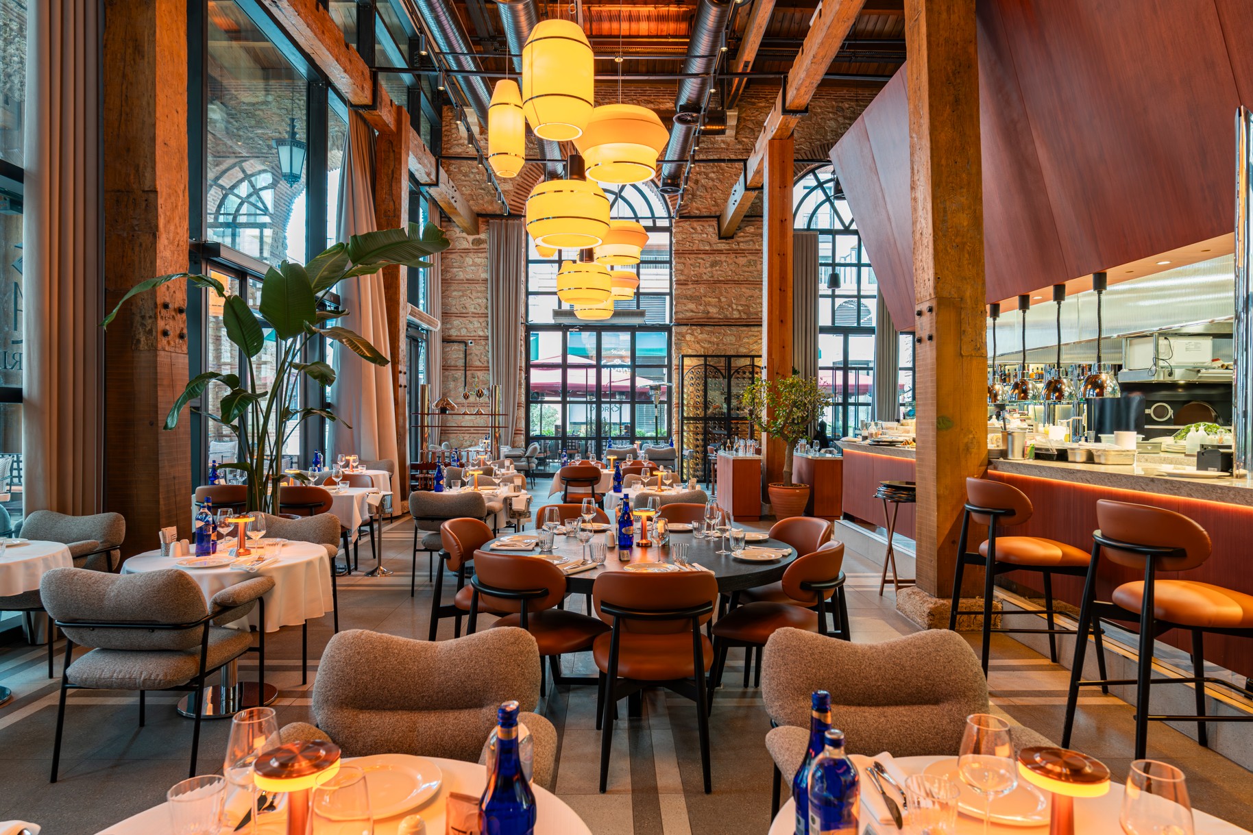 Key Features: Massive arched windows emphasizing the spatial volume, an illuminated bar unit rising to the ceiling like a work of art, exposed raw brick walls showcasing the industrial past, a glass-enclosed wine cellar, and an open kitchen concept.